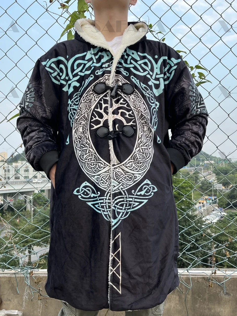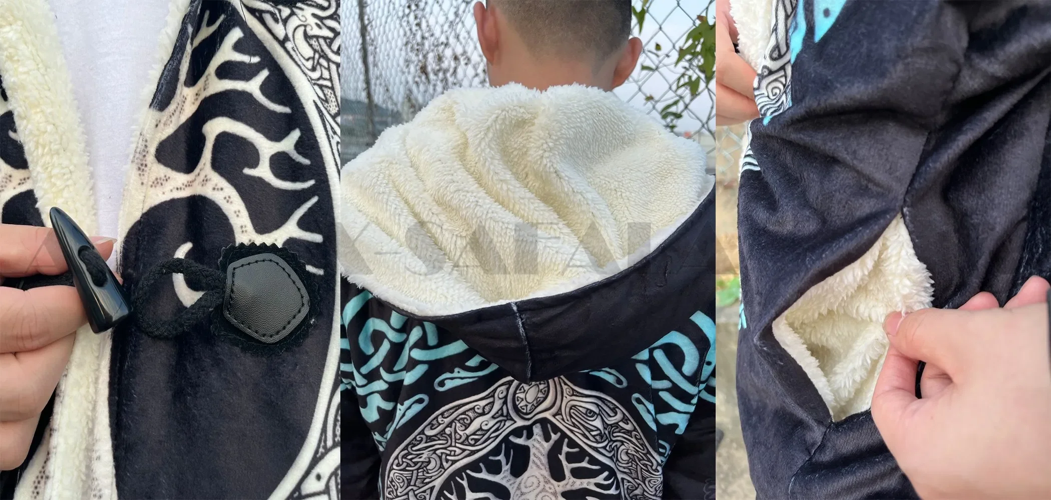 Native Tattoo Symbol Wolf Thick Warm Hooded Cloak Sweatpants Combo Set Overcoat Coat Windproof Fleece Unisex Joggers Trousers-1